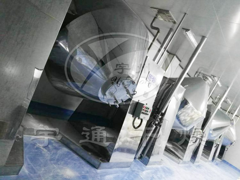 機組除了主體雙錐回轉真空干燥機外還包含自動進料對接裝置、模溫機高溫油加熱系統、真空過濾器冷凝回收系統、出料自動對接裝置、螺帶冷卻機。上部離心機或壓濾機完成工作后雙錐干燥機進料裝置自動對接使物料加入雙錐干燥機內,然后抽真空系統和模溫機系統自動運行進行烘干,到底預設時間后,自動出料裝置自動對接,將雙錐內烘完的物料投入螺帶冷卻機降溫,冷卻到預設時間后可與后部氣力輸送系統聯鎖直接進成品料倉儲存。