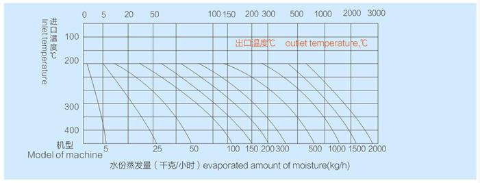 水份蒸發量與物料的特性及熱進風、出口溫度相關。當出口溫度為90oC,其水份蒸發曲線見上圖(供選型參考),隨著產品不斷更新,有關參數變更,恕不預先通知。