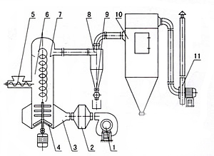 工作原理: 熱空氣由入口管以適宜噴動速度從干燥機底部進入攪拌粉碎干燥室,對物料產生強烈的剪切、吹浮、旋轉作用,于是物料受到離心、剪切、碰撞、磨擦而被微粒化,強化了傳質傳熱。在干燥機底部,較大較濕的顆粒團在攪拌器作用下被機械破碎,濕含量較低、顆粒度較小的顆粒被旋轉氣流夾帶上升,在上升過程中進一步干燥,由于氣固兩相作旋轉流動,固相慣性大于氣相,固氣兩相間的相對速度較大,強化兩相間的傳質傳熱,所以該機生產強度高。 閃蒸干燥機的工作原理較容易理解。我們可以將整個干燥過程分為4個階段—破碎階段、氣固混合階段、干燥階段以及粒度分級階段。破碎階段:破碎是整個閃蒸干燥過程的第一步也是較重要的一步。被干燥的物料狀態主要是膏狀、濾餅狀。如沒有破碎就不能進行閃蒸干燥,由此我們可以得到一個結論:黏性強的物料如直接使用閃蒸干燥機其干燥效果較差,需要適當加入添加劑避免物料結塊。該過程中主要是攪拌片與高速旋轉的氣體配合完成粉碎。氣固混合階段:經過粉碎后,物料在閃蒸干燥主塔內與加熱介質充分的接觸。其中,氣固混合的好壞決定整個干燥速率的大小。為了提高氣流速度,在閃蒸干燥機的底部設置倒錐結構裝置。干燥階段:該過程是熱空氣蒸發物料水分的過程。未完成干燥的物料受到重力的作用下落,繼續破碎與干燥;完成干燥的物料會向上運動,進行下一階段。粒度分級:在干燥主機的上部設置環形擋板,此被稱為閃蒸干燥機分級器。當物料運動經過該分級器時變會受到離心力的作用,呈現不同旋轉半徑螺旋上升的趨勢。粒徑較小的物料從分級器的內孔排出;顆粒較大的物料被留在干燥室內繼續粉碎,待達到標準粒度從內孔排出。